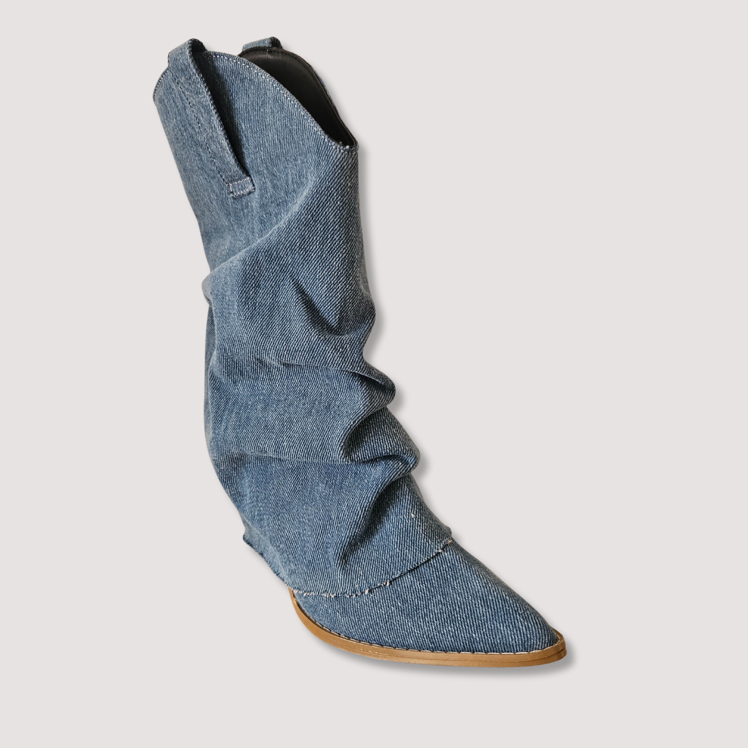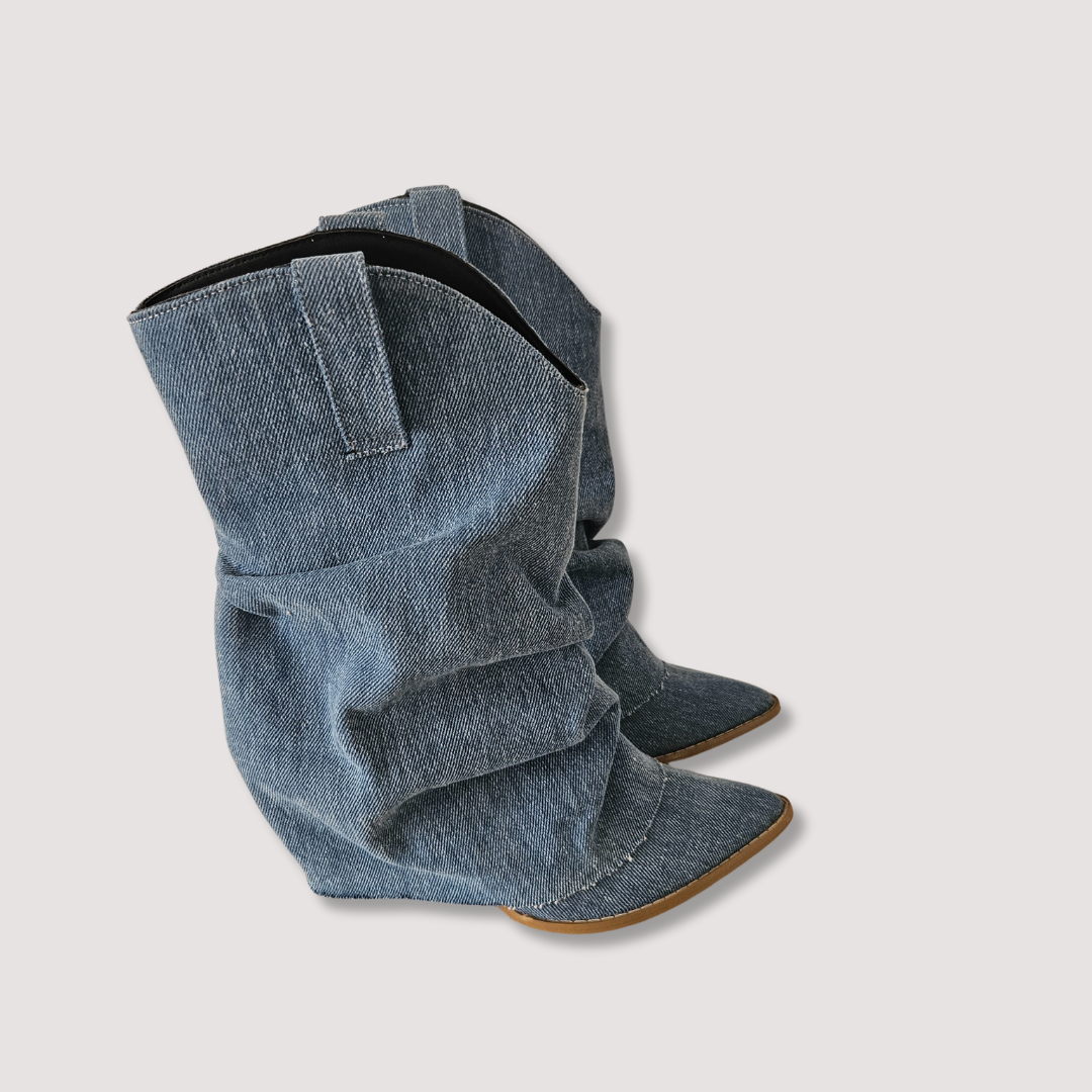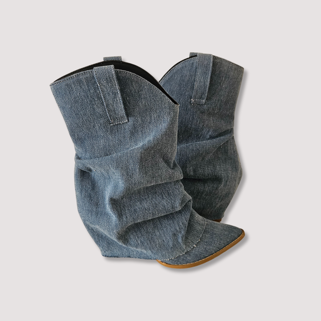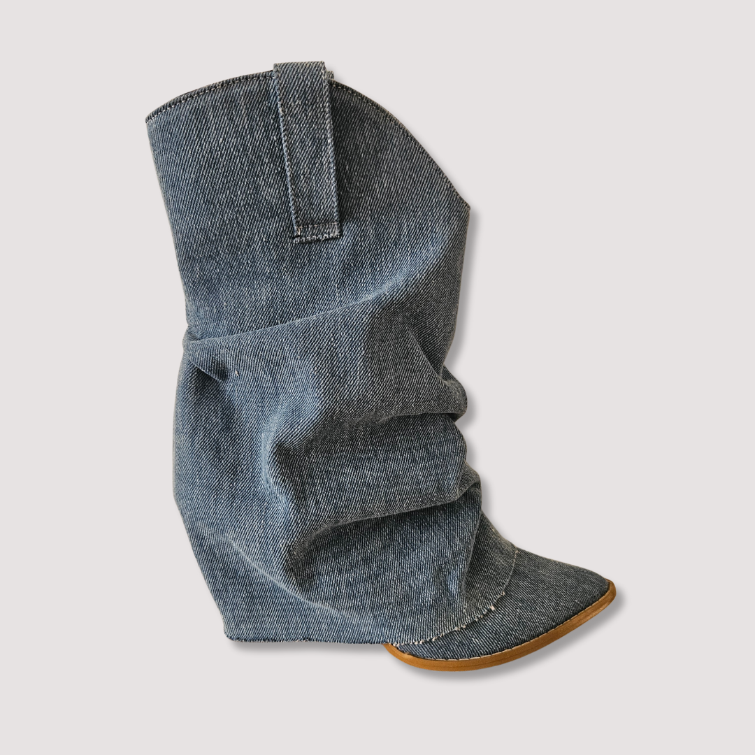 Experimenta la combinación perfecta de estilo y durabilidad con estas increíbles botas artesanales. Corte mezclilla de algodón, tubo media pantorrilla. Con tacón de vaqueta natural de 8 cms y suela de piel antiderrapante. Estas botas no solo lucen espectaculares, sino que también te brindarán la confianza y comodidad que necesitas para conquistar cualquier terreno. ¡Haz una declaración de moda con estas botas únicas en su clase!